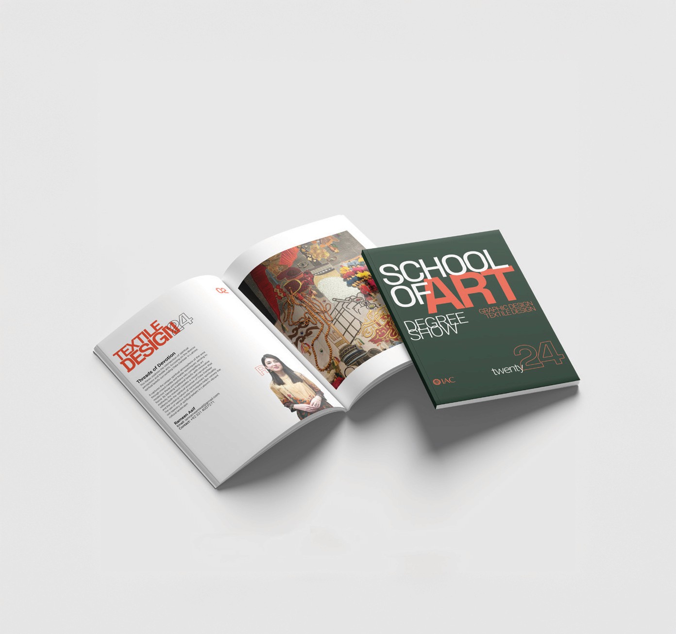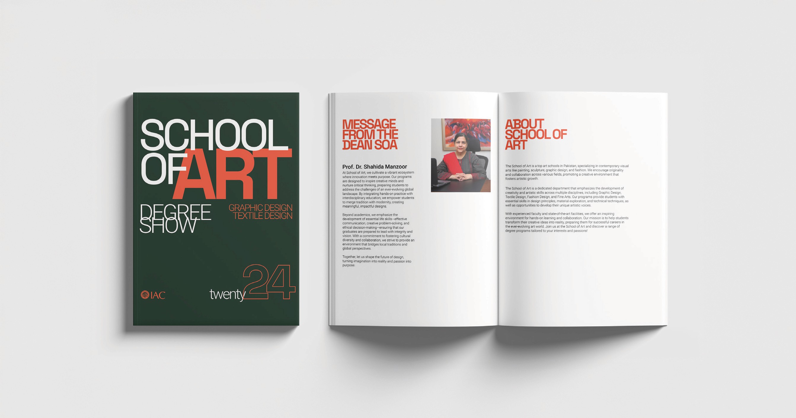 This project was the official School of Art Degree Show Catalog for the Institute for Art and Culture (IAC), Lahore, undertaken during my time as a student and the head of the university's creative cell. I was tasked with creating the definitive annual document that celebrates and showcases the diverse thesis work of the graduating students.