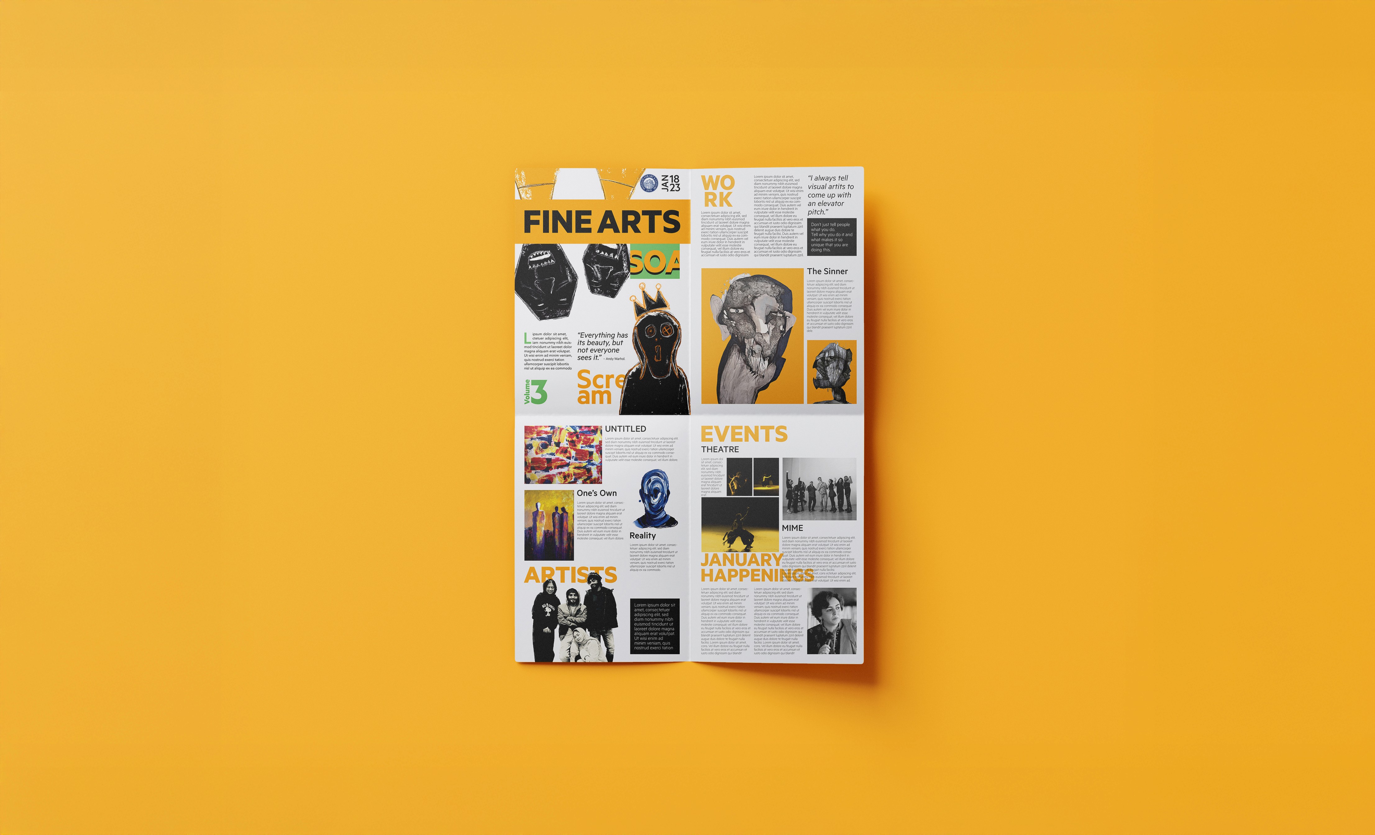 Out of the various schools, I chose the School of Art (SOA), specifically focusing on Fine Arts. The goal was to demonstrate how a layout can communicate the "vibe" and energy of a department even when the final copy isn't yet available.