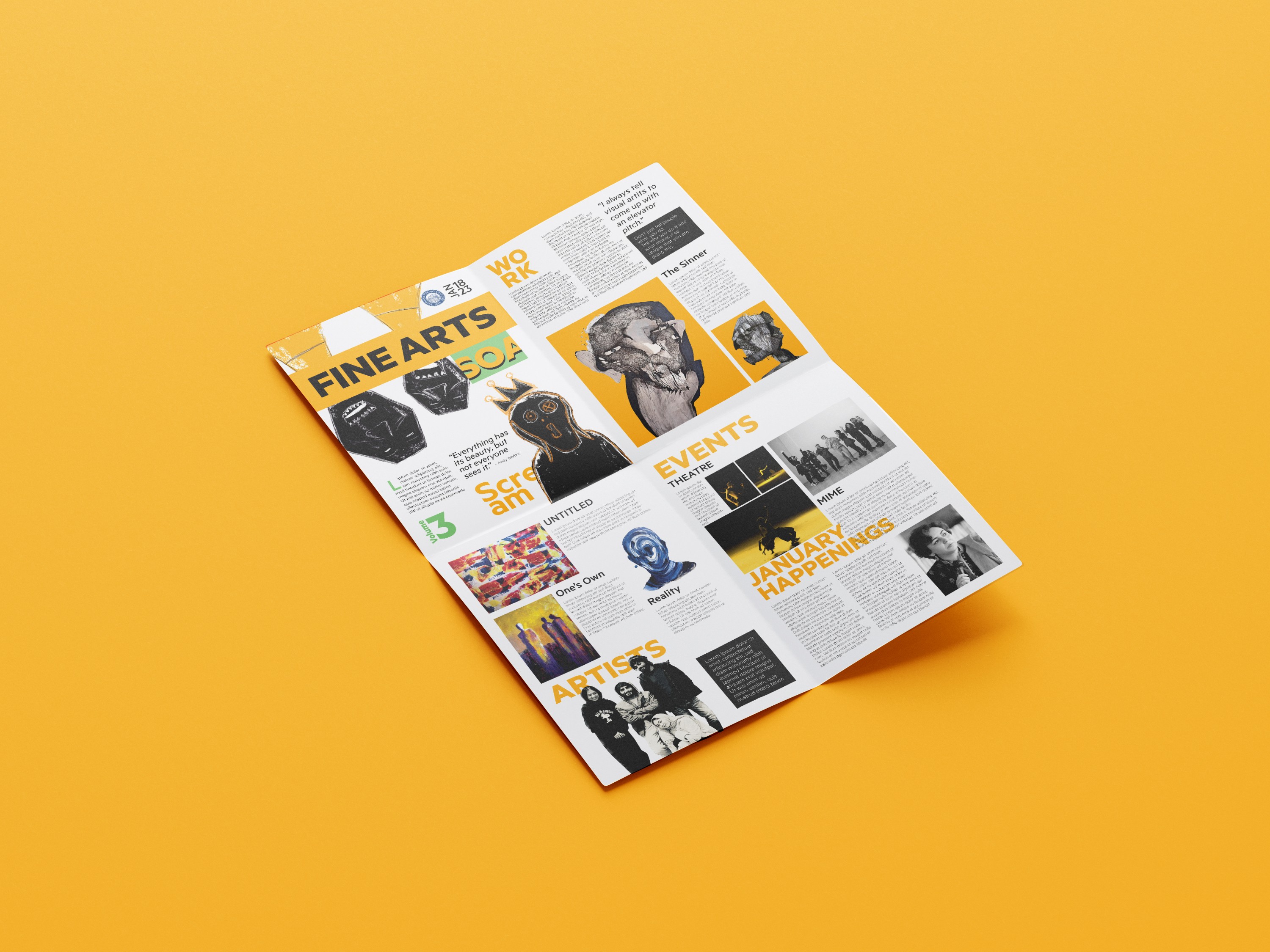 Original Artwork: The cover features my original pieces: "Yellow Laugh" (the flipped figures) and "The Scream" (an adaptation inspired by Edvard Munch). Using my own art allowed me to control the color story and emotional tone of the layout.