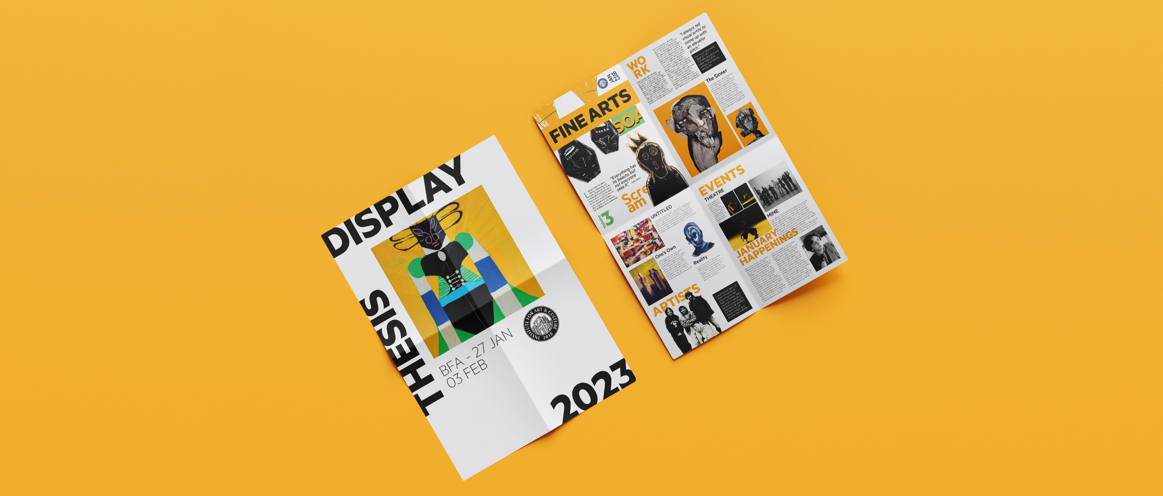 The Thesis Poster: For the back, I created a high-impact announcement for the 2023 Thesis Display. I featured the work of one of my favorite artists, Adebayo Bolaji, using his vibrant style to anchor the poster’s professional aesthetic.